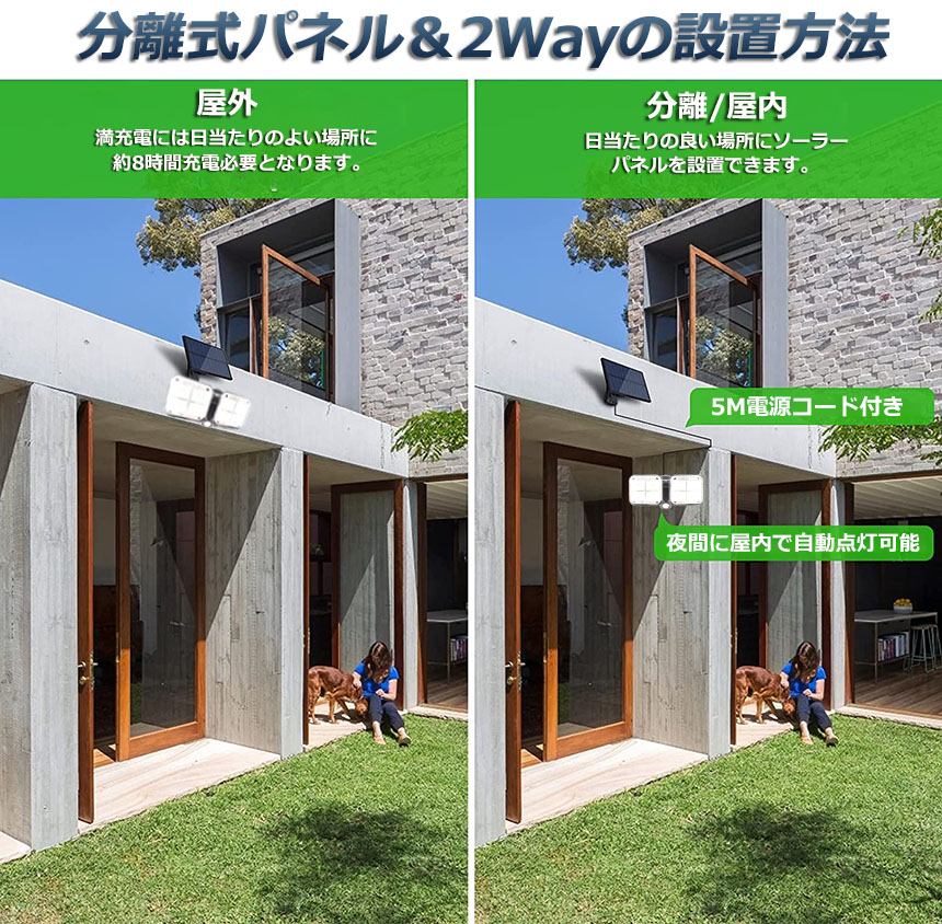 【5mコード付き分離型ソーラーセンサーライト】ソーラーパネルからライトまで5mのコードがあり、屋上でソーラーパネルを取り付けて、軒下や室内で本体を設置して使用することも可能なので、置き場所を選びません。動体センサーと明暗センサーがあって、昼間が自動的に消灯して、夜間に自動的に点灯します。