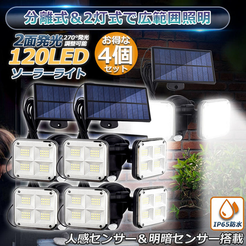 【120LED・2面発光・270°照明】 120個のLEDチップが搭載しており、夜間により強い光を提供できます。2面発光のデザインで照明角度が270°に達すだけでなく、両側のライトは上下左右120°回転することができますから、照明が必要な場所で照明角度を自由に変えられます。ラーパネルの部分は上下左右80°の角度に調節できますので、太陽の良く当たる方へ向けられ、十分にソーラー充電できます。センサー検知角度が120°になりましたので、夜の防犯灯としてもすごく実用です。