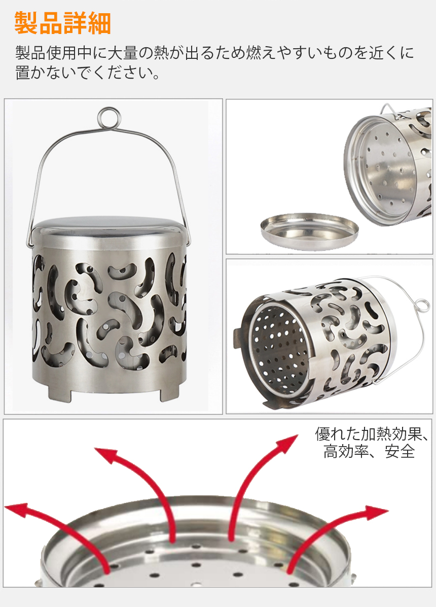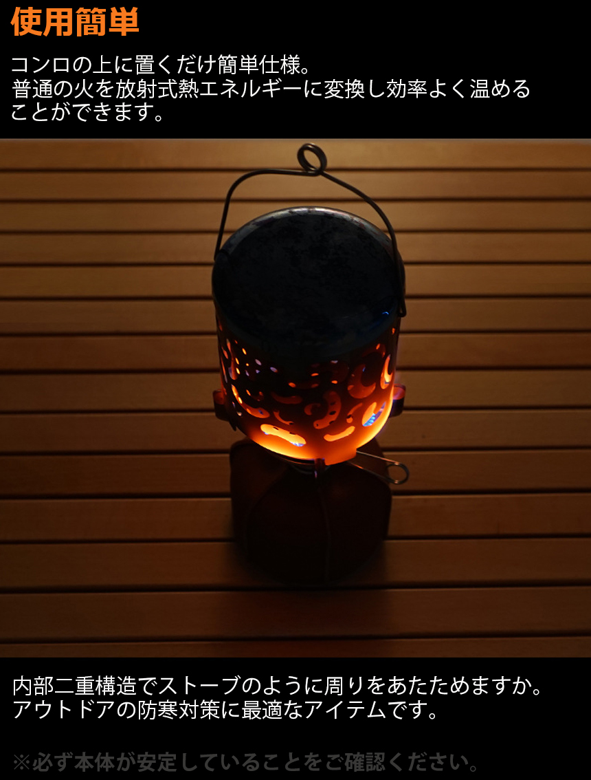 【二重熱放射構造】内部は二重構造で熱伝達を加速することができます。ストーブのように周りを暖かくします。 キャンプ・登山・釣り・ツーリングなど、アウトドアの防寒対策に最適なアイテムです。遠赤外線ヒーターとして使えるアタッチメント。
