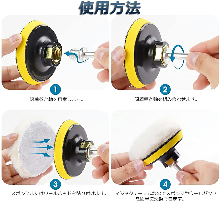 【取り付け簡単】 取り付け簡単、マジックテープ式で脱着する便利なポリッシャースポンジで、電動ドリルやグラインダーに取り付け可能です。