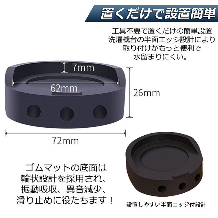 【商品仕様】振動吸収マットの高さ:2.6cm、内径:6.2cm、直径:7.2cm、耐加重:300KG(4個使用時)。