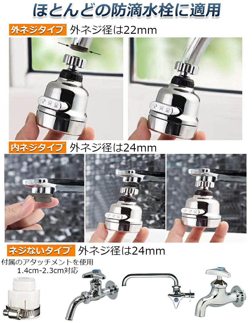 【幅の広い対応性】ほとんどの防滴水栓に適用します。外ネジタイプ、内ねじタイプ、万能アタッチメント付属なのでネジがないタイプも対応(1.4cmから2.3cmまで)可能です。