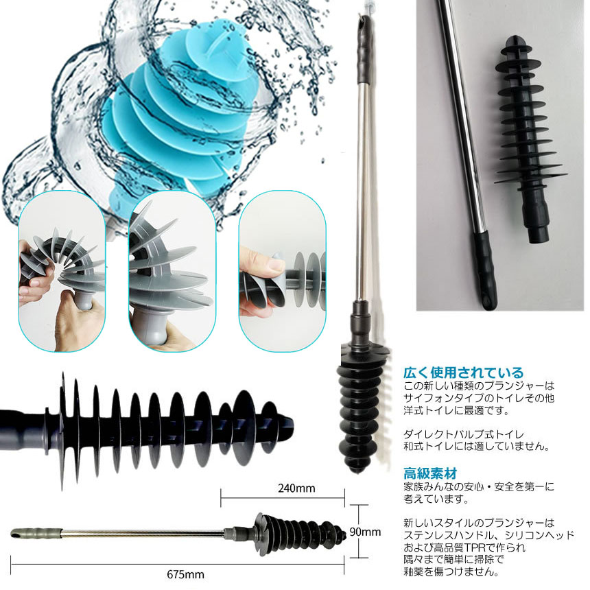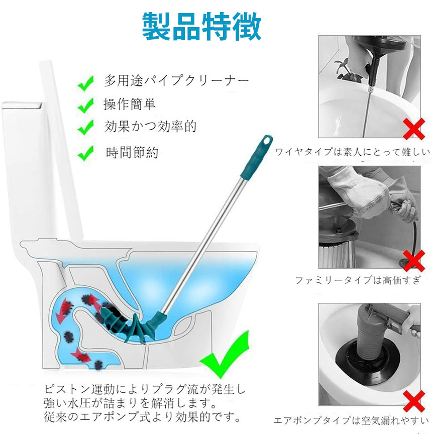 【革新なデザイン】柔軟なシリコンヘッドブラシを採用した、新たなトイレパイプクリーナーアップグレード2.0バージョンです。ピストン運動原理で発生した水勢を利用して汚れ物を排出できます。従来のワイヤタイプやエアポンプタイヤと比べて、汚れ飛ばさず力入れやすいです。
