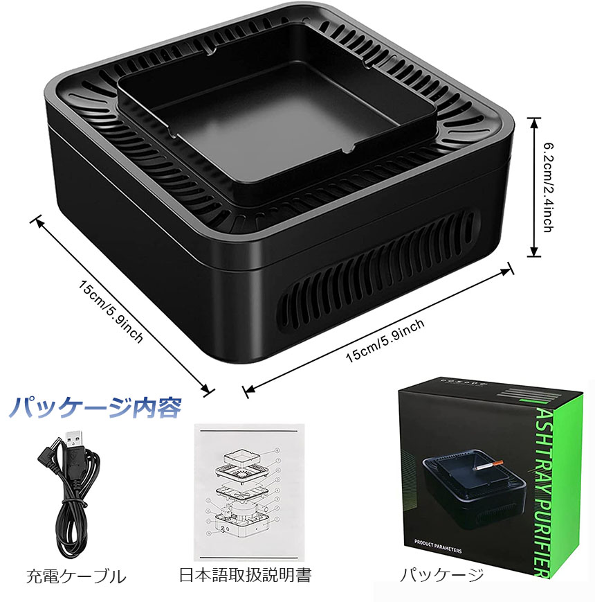 【スモークレス灰皿 】:マイナスイオン発生機により、副流煙もイオンで取り込み、それらを分解・排除する多機能灰皿です。充電式でスモークレス灰皿付きな空気清浄機です。副流煙を軽減でき、タバコの煙を吸い取ってくれるスモークレス灰皿なのです。