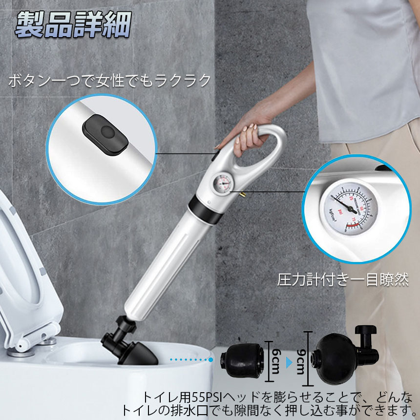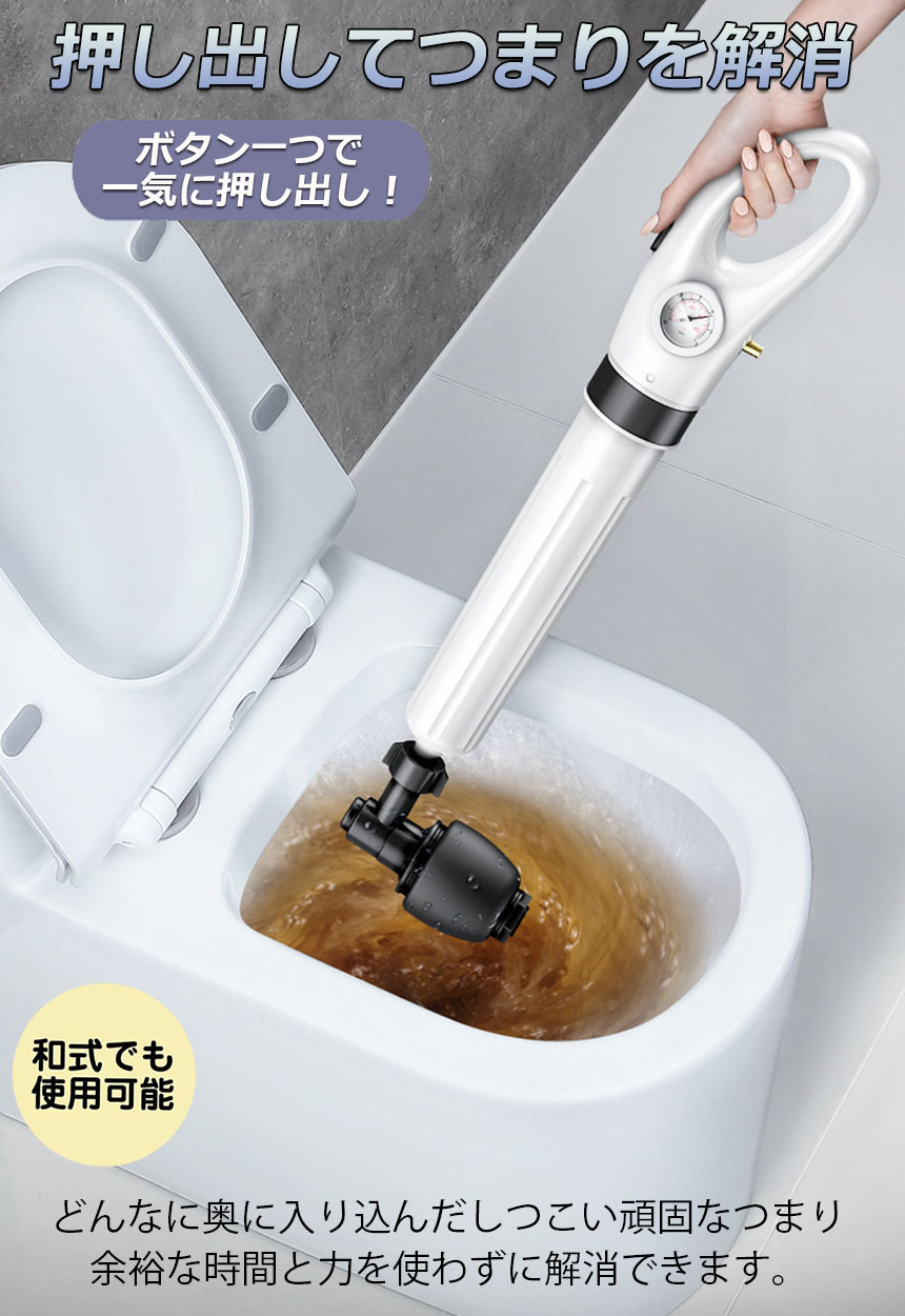 【ワンタッチでつまりを解消】本体と空気入れを接続し、次は対応な先端ゴムを選び、それから空気入れで適当な圧力を加圧し、ワンタッチつまりを解消します!トイレ、浴室、洗面台の詰まりの除去に、強力な気圧ですばやく詰まりを解消します。詰まり水に触れずクリーンな作業が可能。