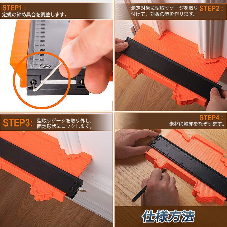【使いやすい】取りたい型に型とりゲージを当てる;型を取ったら、櫛が振動等で動かないようロックを掛ける;櫛に沿って線を引き、型を転写する;転写した跡を切り取る。たったの4ステップ、慣れていない方が使用しても簡単にかたとりすることが可能。