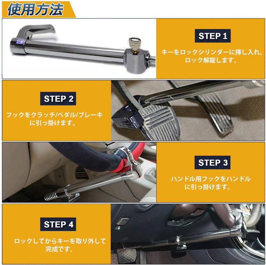 【サイズ】全体 44cm-68cm ロック部分:32cm 重量 1.5kg ハンドルに合わせて長さを調節できるのでほとんどの車でご使用いただけます。 軽自動車、乗用車、トラックなど車種をこだわらずに取付可能です。