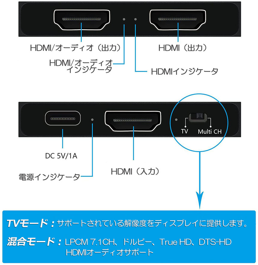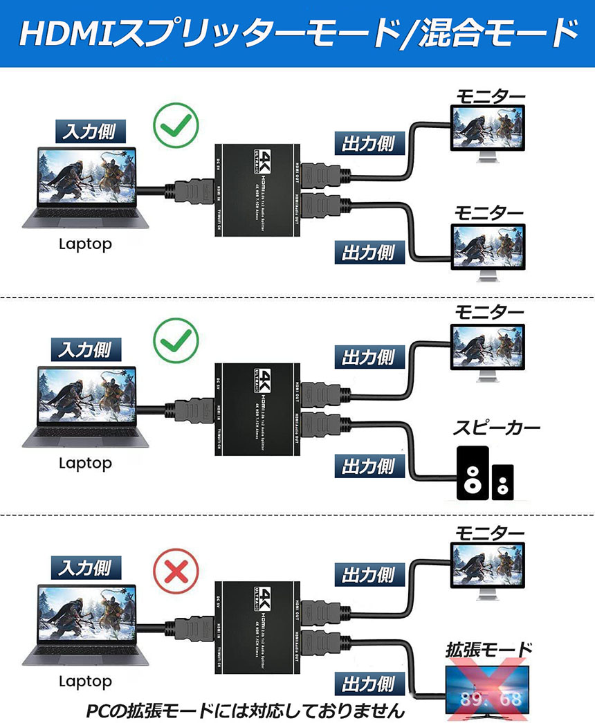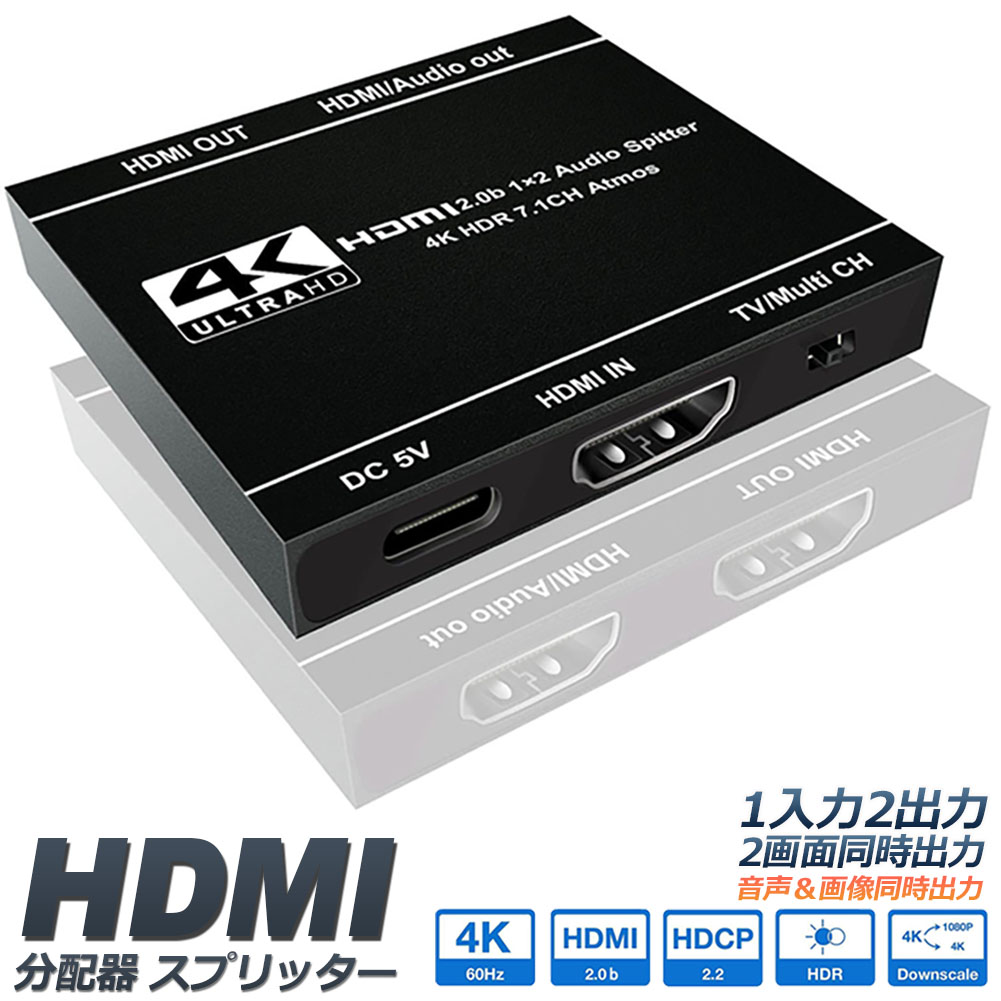 HDMI スプリッター 分配器 1x2 4K 60Hz デュアルモニター用 HDR Dolby Vision Atmos互換 18 Gbps HDCP 2.2 HDCP 2.3 HDCPバイパス<br>