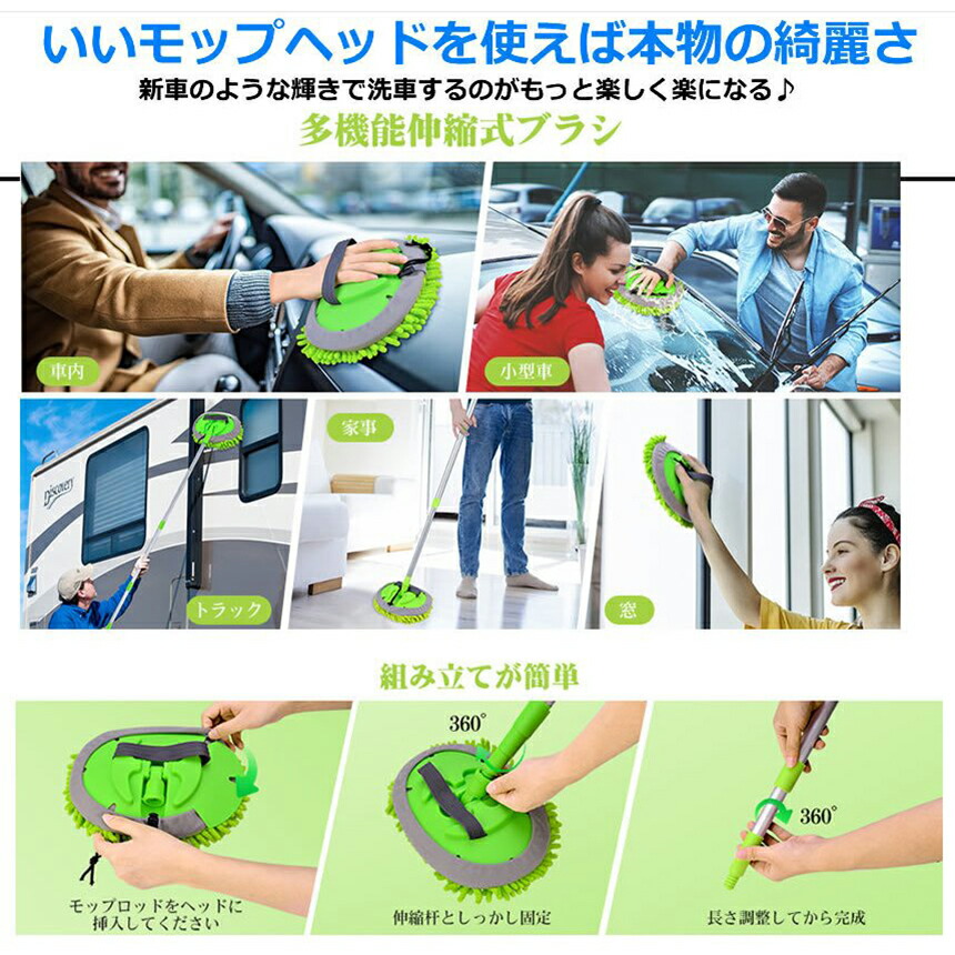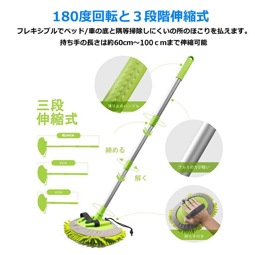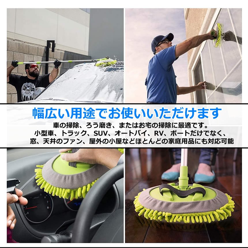 【様々なシーンで大活躍】車の掃除は勿論、家、仕事場や他の場所でも大活躍になります。普通のタオルより掃除できる範囲を広げて、洗車時間を短縮できます。伸縮式のデザインで、ご使用者様の身長により長さを調整可能です、女性でも片手で簡単に扱えるほど軽量な洗車モップで長時間使用しても手が疲れません。