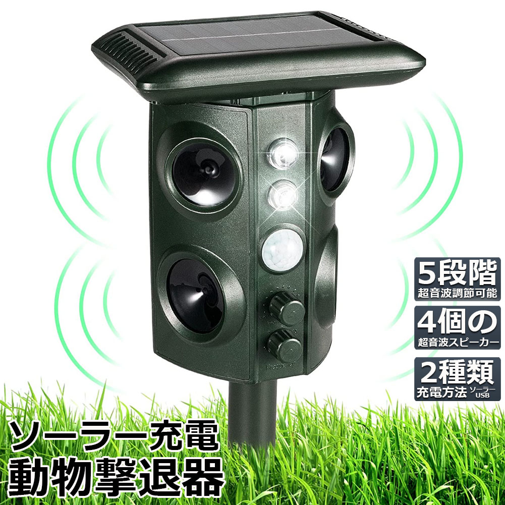 超音波+強力LEDフラッシュライト+機械波発振(模擬耐震機能)+自動混合モード(1ー2ー3ー4モードを繰り返します)、高効率的に動物撃退できます。4個の超音波スピーカー付きで、動物撃退の有効範囲が300m2になり、対応動物種類も増えております。超音波の周波数とセンサー感度が調節でき、また超音波発振周波数は各都度によって自動的に変動し、動物の慣れを防ぎます。弊社の動物撃退器は人体、環境に悪影響が与えないので、ご安心使用いただけます。