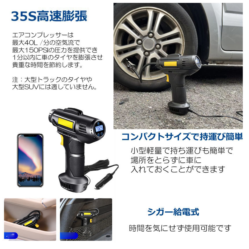 【35S高速膨張】コードレスエアコンプレッサーは最大40L /分の空気流で最大150PSIの圧力を提供でき1分以内に車のタイヤを膨張させ貴重な時間を節約します。