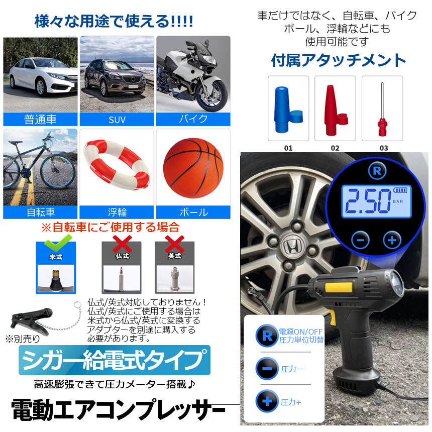 車だけではなく、自転車、バイクボール、浮輪などにも使用可能です。ご注意:自転車(仏式/英式)にご使用する場合は米式から仏式/英式に変換するアダプターを別途に購入してください。