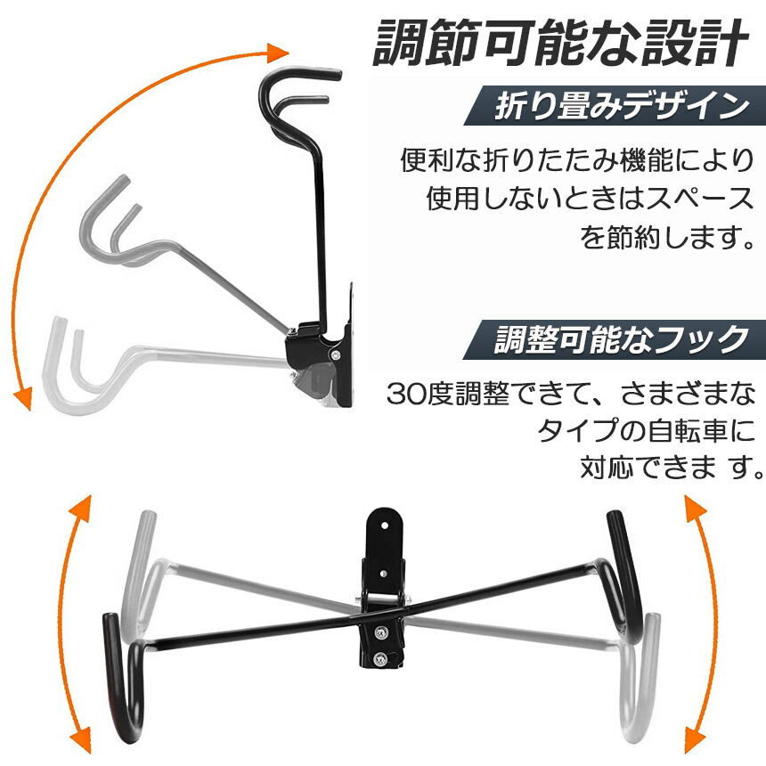 【角度を調整可能】左右のフックの角度を変更して、傾斜したフレームの下でも自転車をできるだけ水平に保つことができます。30度調整できて、さまざまなタイプの自転車に対応できます。