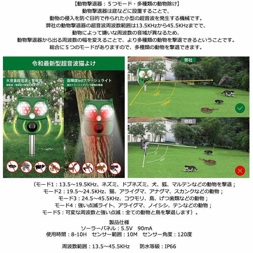 弊社の動物撃退器の超音波周波数範囲は13.5KHzから45.5KHzまでで、動物によって嫌いな周波数の音域が異なるため、動物撃退器から出る周波数の幅を変えることでより多種類の動物を撃退できます。目的に応じて5つのモードから選択できます。