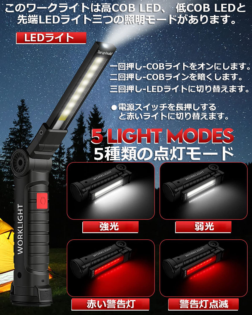 【5つ点灯モード】電源ボタンを押して、モードを切替します。COB LED(強)、COB LED(弱)、先端LEDライト、赤いライト、赤いライト点滅。キャンプ、アウトドア、災害時にとても便利です。