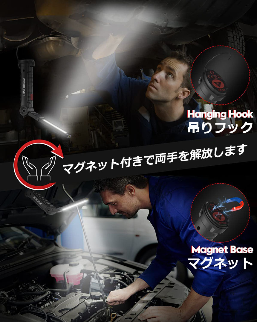 【首振り機能】折りたたみ式のワークライトで、360°トランスフォーム死角なく、どんな角度も自由に変換。製造ライン、自動車整備、工事現場、倉庫作業、トラック荷台作業などに適用します。