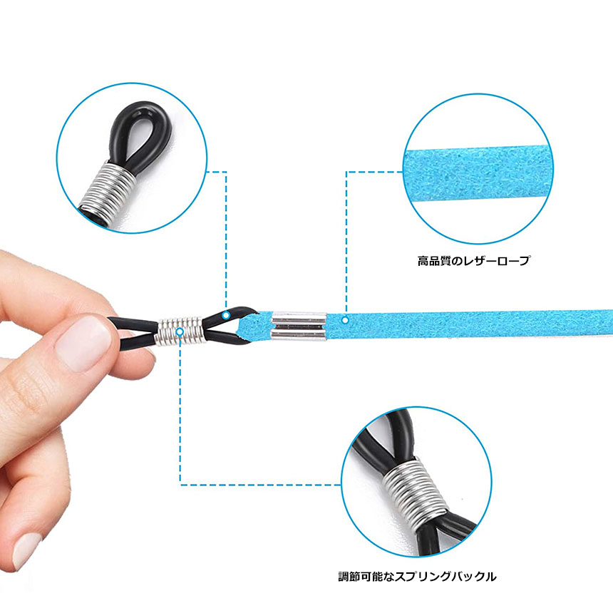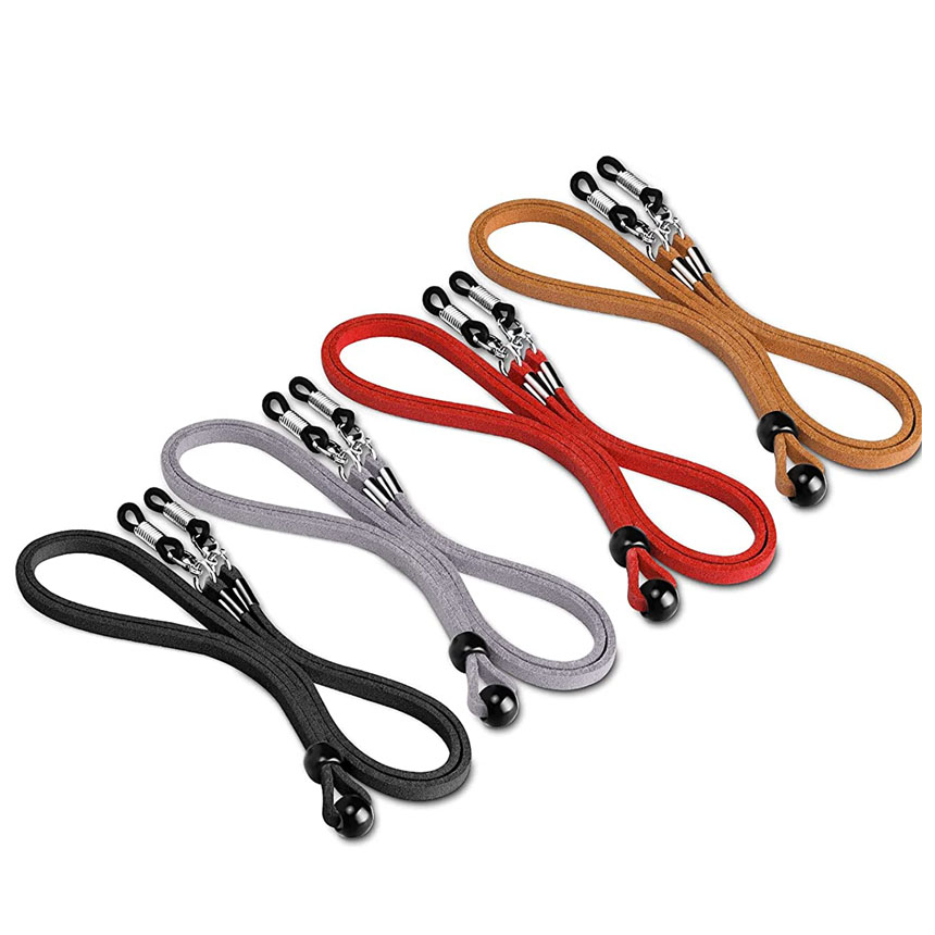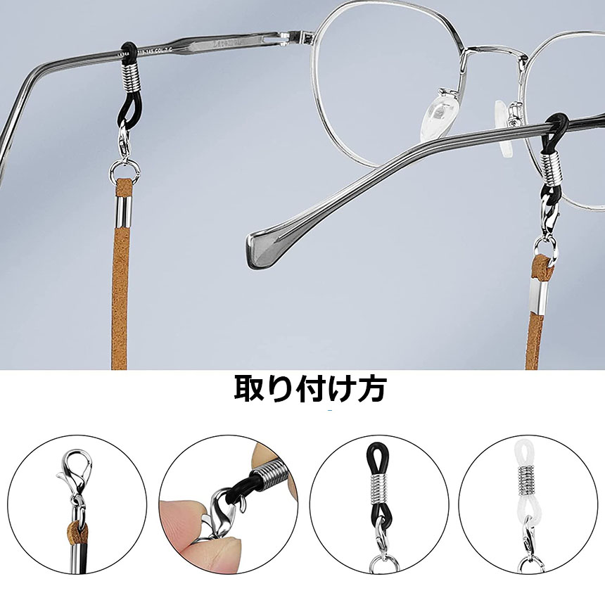【商品仕様】メガネストラップ×4本、合皮スエード、ゴム、プラスチック、鉄(表面メッキ加工)