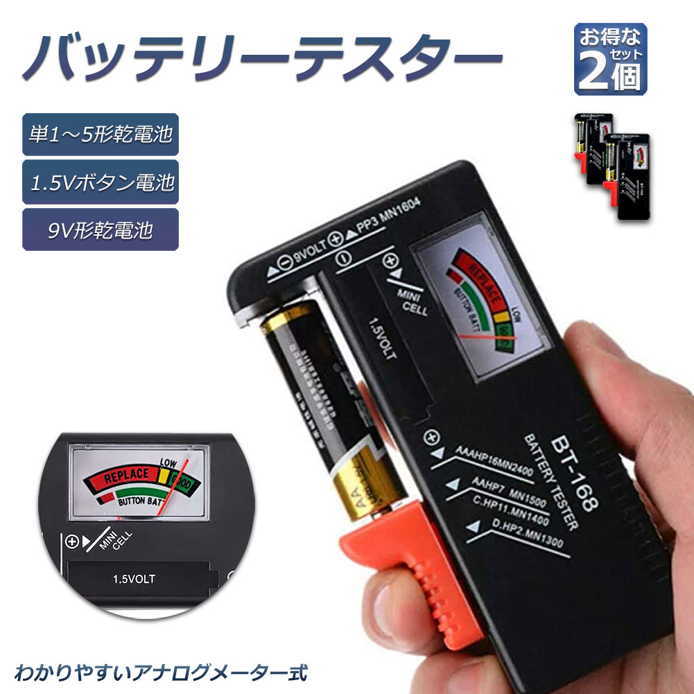 電池チェッカー バッテリーテスター 電池残量測定器 電池 チェッカー 乾電池やボタン電池の残量チェック 残量 乾電池 単1 単2 単3 単4 単5 9V 角型 ボタン 測定 計測 アナログ 小型【2個セット】