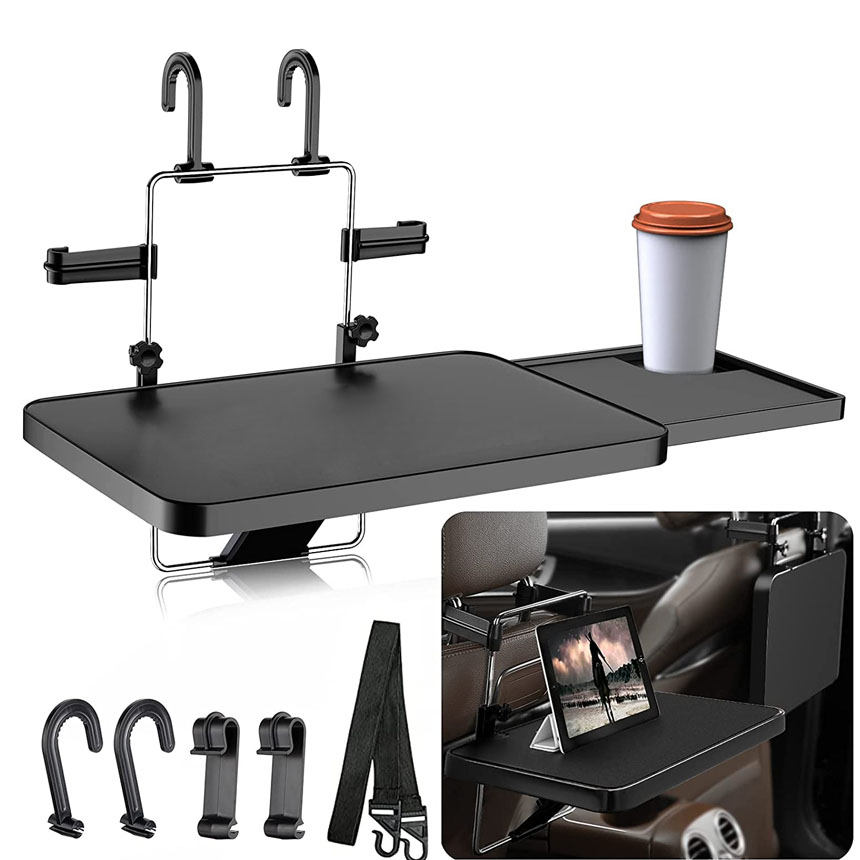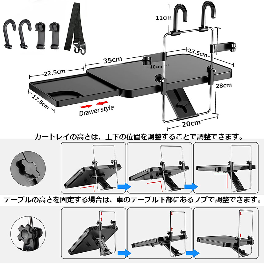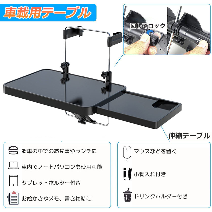 【簡単取り付け】 車のハンドルやヘッドレストに引っ掛けるだけで簡単に装着できる、ハンドルテーブルです。 ドリンクホルダーの付いた便利なスライド式サイドテーブルも付いています。
