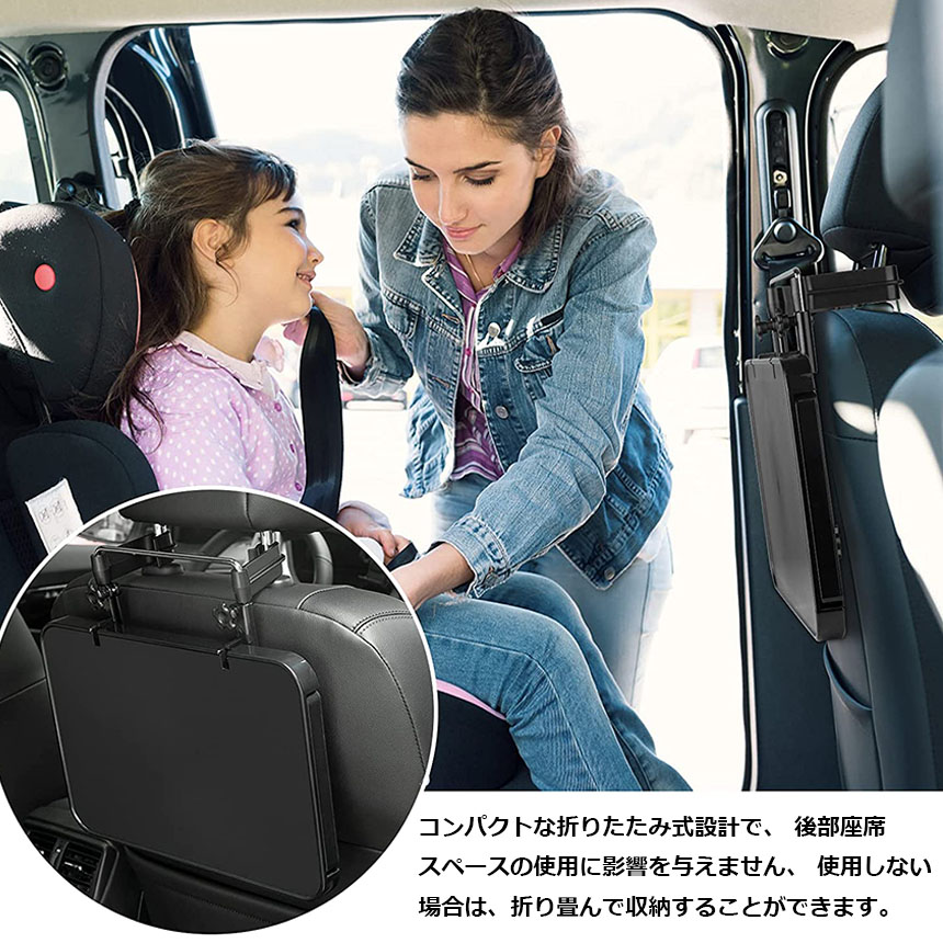 【運転席・後部座席に対応】 直径約34mmのハンドルまで装着可能です。 取外し可能なフックを付け替えることで、ヘッドレストに取り付けることができるので、後部座席のテーブルとしても使用できます。 運転席はハンドル、後部座席はヘッドレストに装着します。
