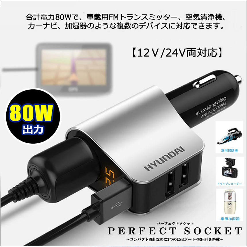 合計電力80Wで、車載用FMトランスミッター、空気清浄機、カーナビ、加湿器のような複数のデバイスに対応できます。