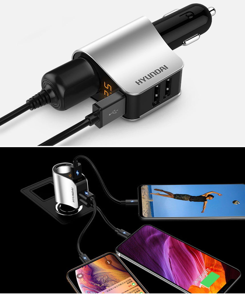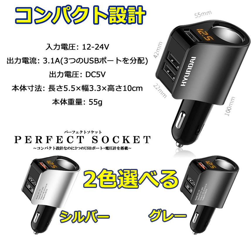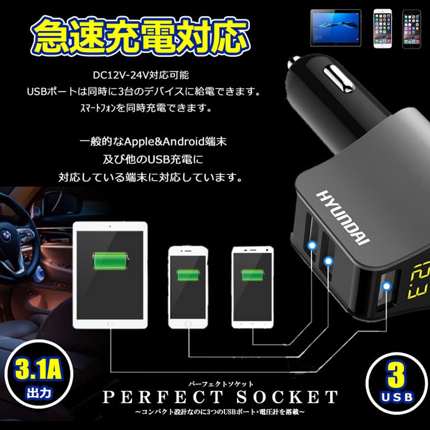 シガーソケットとして三つUSB出力ポートを搭載しており、iPhone、Androidのスマホやタブレットなど、デバイス3台を同時に充電可能です。