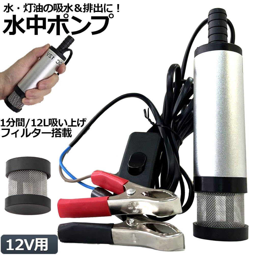 【商品仕様】:ON/OFFスイッチ付き 高さ:約16cm ポンプ直径:約38mm 吐出口径:約16mm ケーブル全長:約3m 吐出量:約12L/min 揚程:2m 電圧:DC-12V 電流:1.5A 接続方式:クランプ(ワニ口クリップ) 材質:ステンレス 適用範囲:ディーゼル、水、灯油、オイル等