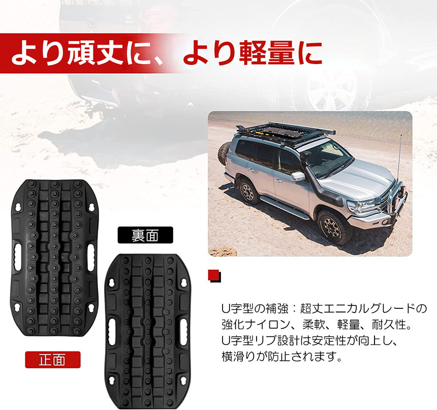 【雪道、悪路から 脱出】:サンド(砂)、マッド(泥)、スノー(雪)でのスタック脱出に大活躍!空転したタイヤの前に差し込むだけで、脱出の補助が出来るスタック脱出用ラダーです