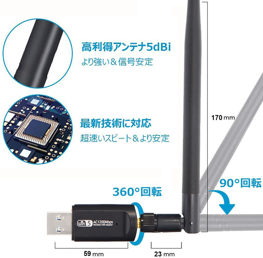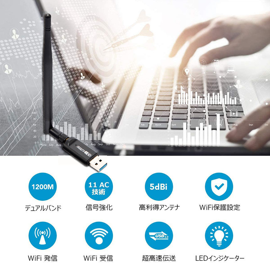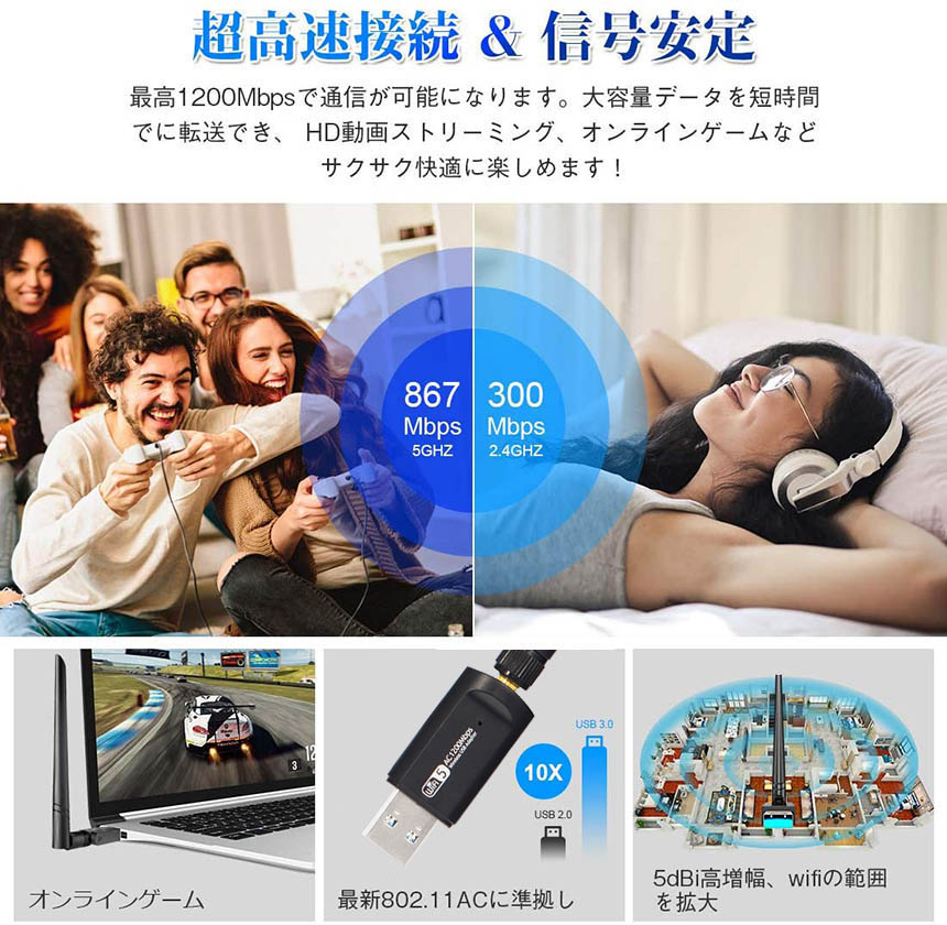 【USB 3.0ポート・高速通信】USB 3.0はUSB 2.0より10倍速くて、最高のスループット性能とWi-Fiアダプタ用のより安定したインターネット接続を提供します。本無線LAN子機は最大5GHz帯(867Mbps)+2.4 GHz帯(300Mbps)の超高速接続、最高1200Mbpsで通信可能になります。大容量データを短時間でイライラする事無く転送出来ることを実現する。