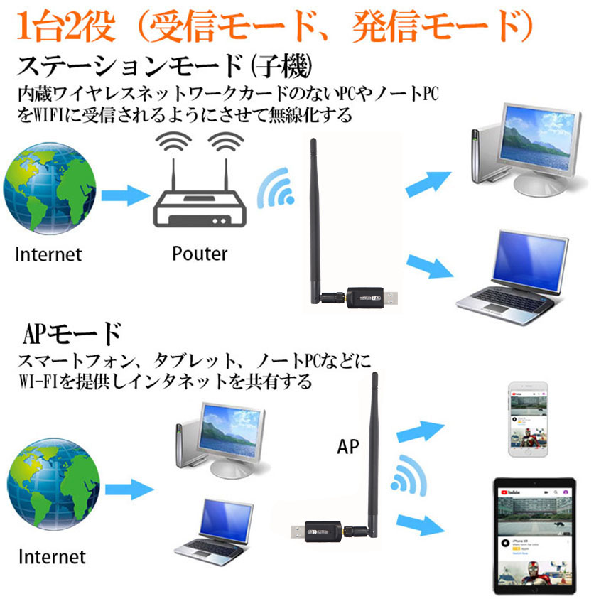 【親機、子機両用】親機、子機どちらとしても使え、ステーションモードとAPモードがあって、有線ケーブルが必要な古いパソコンをWIFIに受信されるようになって、スマートフォン、タブレット、ノートPCなどにWI-FIを提供されます。電波干渉に強い5GHz帯と2.4GHz帯に対応。