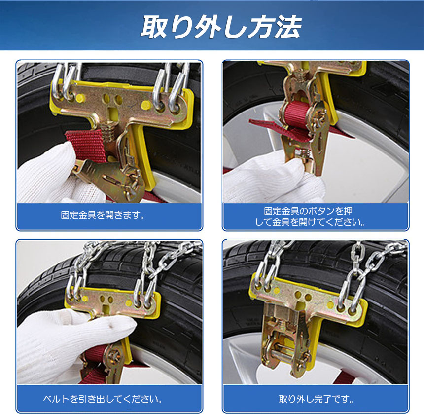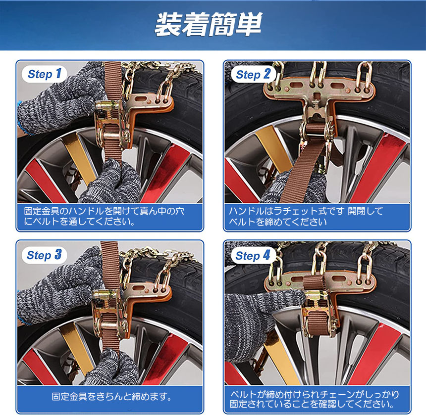 ラチェット式の固定金具でチェーンを取り付けします