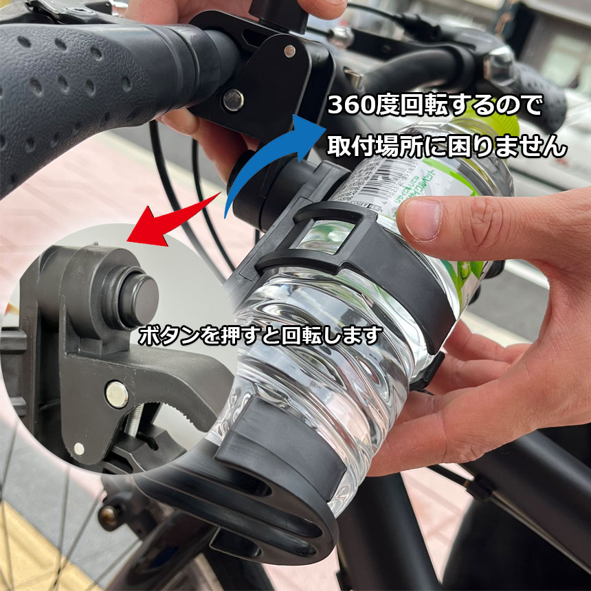 【回転角度360で調整可能】ボタンを押すことで360度回転するので取付場所の幅が広がります。本製品は自由に360度回転するので取り付け場所によって縦向きに装着することも可能なカップホルダーです。