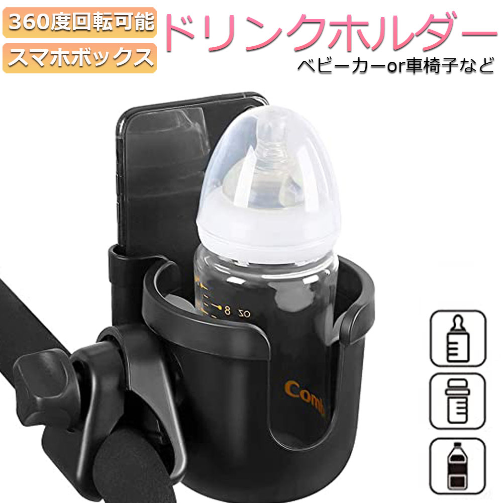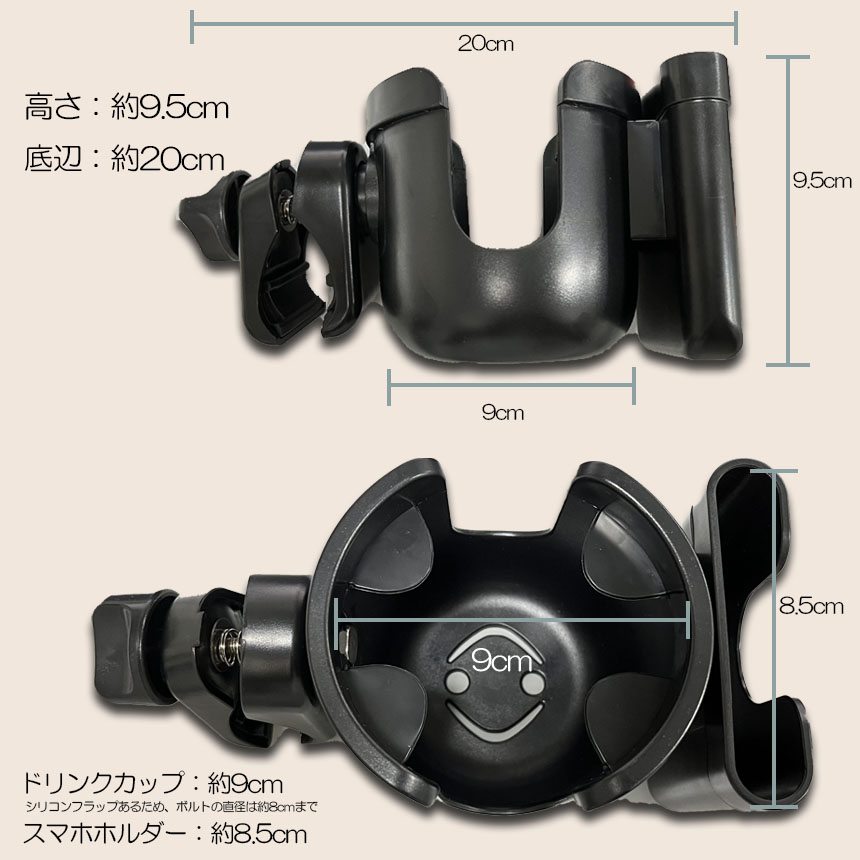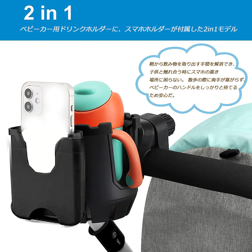 【取付簡単】:ベビーカーに簡単取り付け!ドリンクとスマートフォンが収納できるドリンクホルダーです。取り付け部分が360°自由に回転するので取り付け場所を選びません。ホルダー部分内側はシリコン製の滑り止め付き!しっかりホールドするのでどんなカップにも対応します。ドリンクホルダーは直径約8cmまで対応