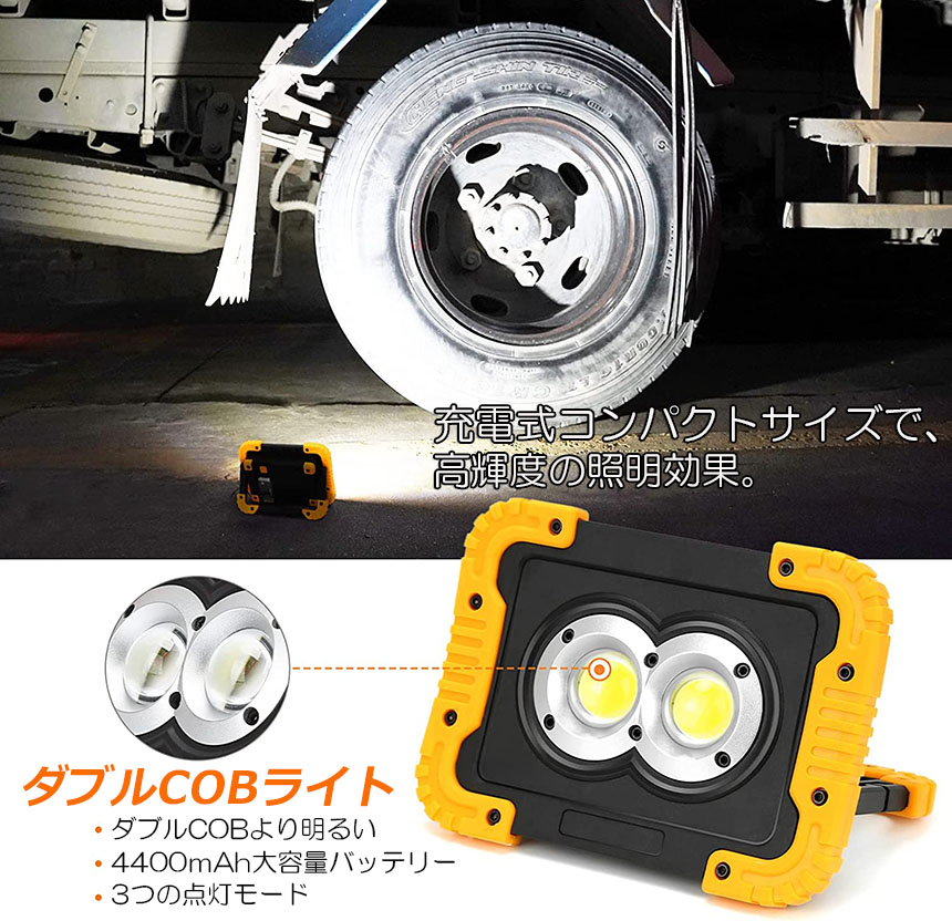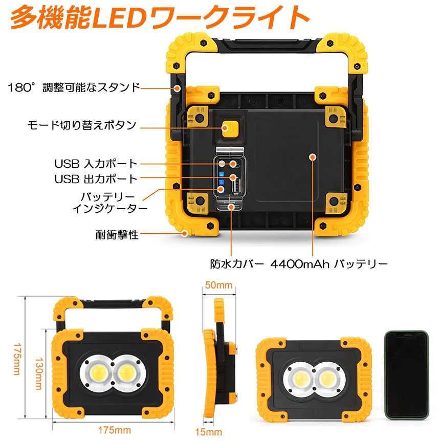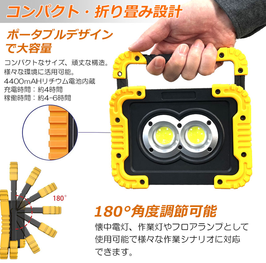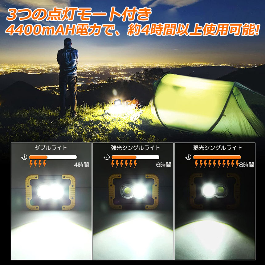 【様々なシーンに大活躍】4400mAhの大容量USB充電式バッテリー搭載LED投光器はキャップ・夜釣り・登山・現場工事・車の整備作業・停電対策・災害対策・倉庫照明など場合に不可欠な屋外屋内用LED照明ランプです。