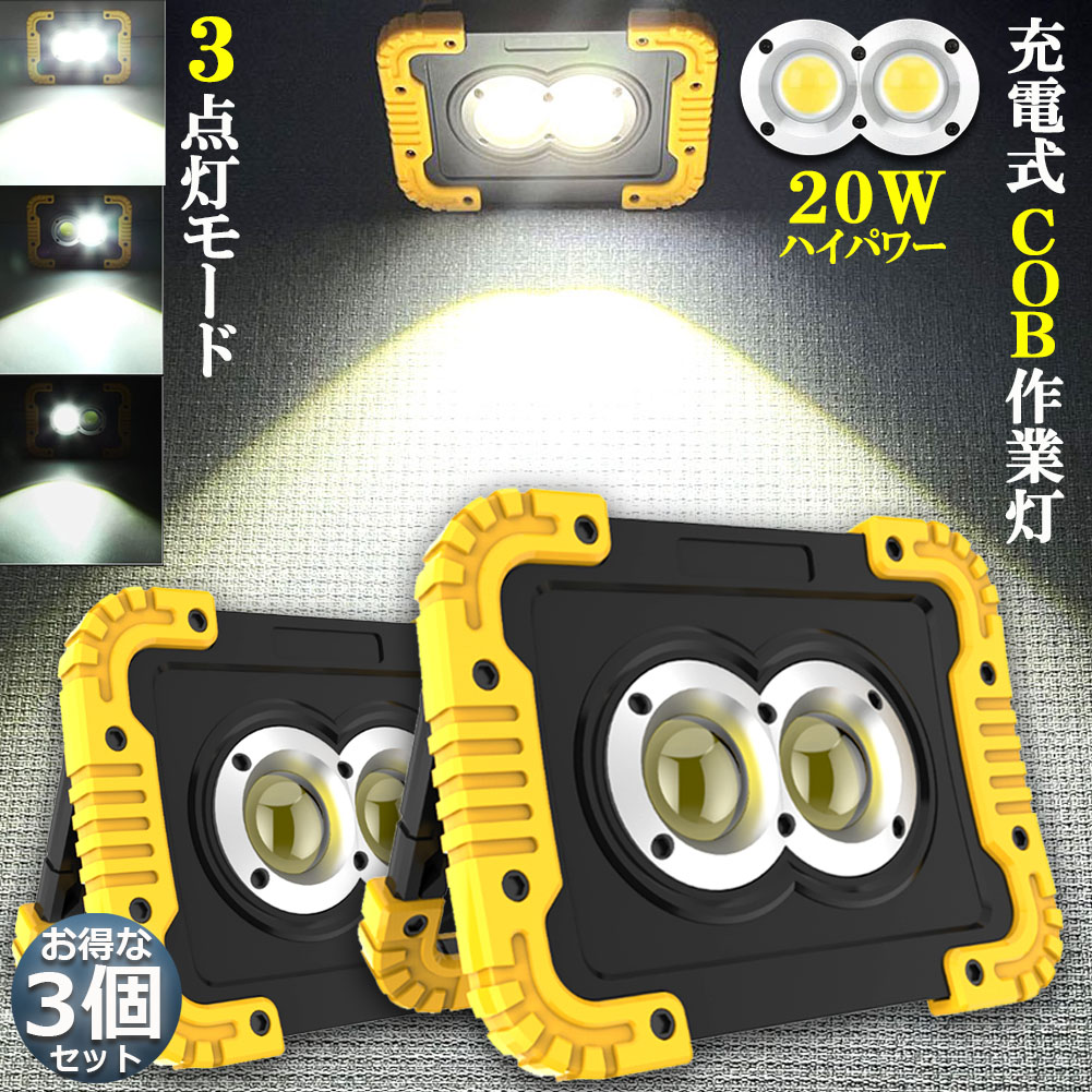 【ダブルライト・3つの点灯モード】10W COBチップを2個搭載している投光器です。暗いところで作業は楽になれます。三つ点灯のモードが自由切り替え可能です。電源ボタンを押すとダブルライト、強光シングルライト、弱光シングルライトモードを切替できます。場所に合わせてモード切替を通してさまざまな作業ニーズを満足することが可能です。