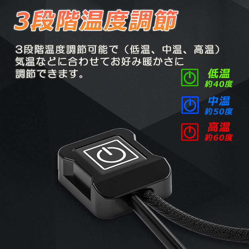 【三段階の温度調整】内蔵のインテリジェント温度制御チップ、3速調節可能な温度、インテリジェント温度制御がより便利です ハイエンド 左と右の温度を同じに合わせる、加熱不足や過熱などを防ぎます。:赤色のライトは常にオン、ミッドレンジ:青色のライトは常にオン 20W、ローエンド 15W、緑色のライトは常にオン 10W。ケブラー材質を採用し、加熱がもっと早く、更に熱が均一にします。40℃、50℃、60℃の三段階温度調整可能、消費電力が低く、使用寿命も長い。