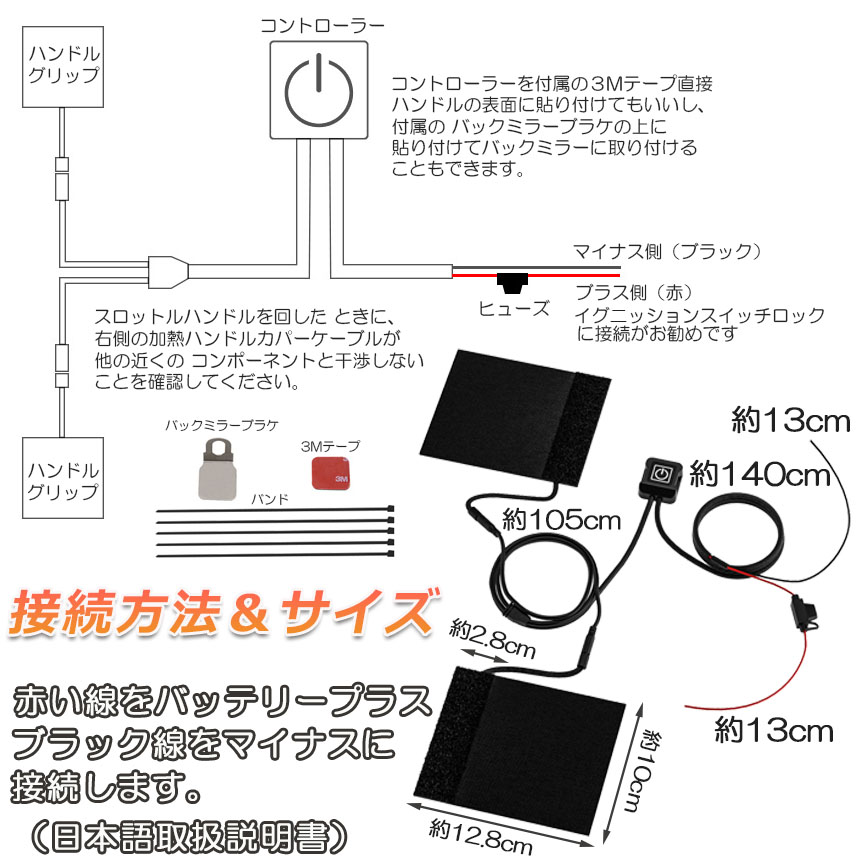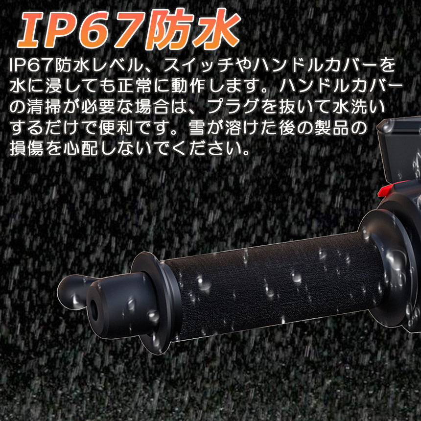 【IP67防水型】IP67防水レベル、スイッチやハンドルカバーを水に浸しても正常に動作します。ハンドルカバーの清掃が必要な場合は、プラグを抜いて水洗いするだけで便利です。グリップヒーターを洗うときは、プラグを抜くだけで水洗いできるのでとても便利です。雪が溶けた後の製品の損傷を心配しないでください。