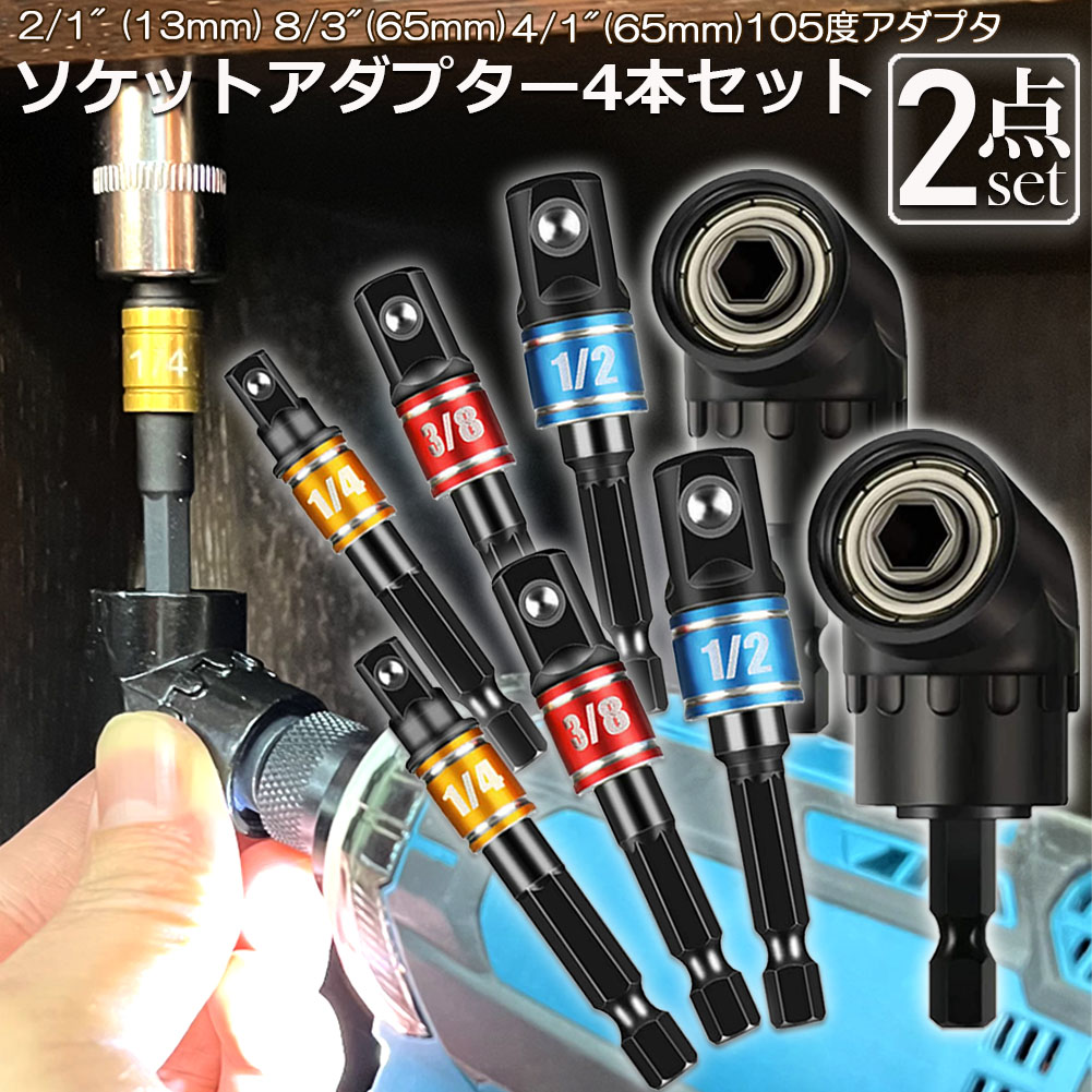 ソケット アダプタ L型 六角シャンク 1/4 3/8 1/2 ドリルアダプター ソケットアダプター 105度 直角ドリルビット 延長ドリルビット 磁気ビットソケット ビット ソケット インパクト DIY 【2セット】