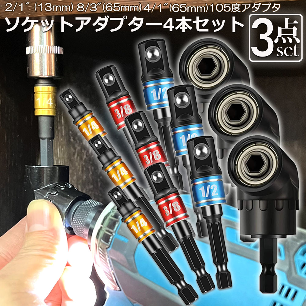 ドリルアダプター ソケットアダプター L型 六角シャンク 1/4 3/8 1/2 ドリルアダプター ソケットアダプター 105度 直角ドリルビット 延長ドリルビット<br>