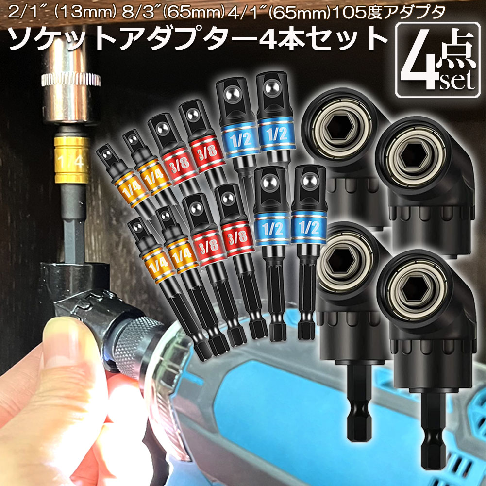 ソケット アダプタ L型 六角シャンク 1/4 3/8 1/2 ドリルアダプター ソケットアダプター 105度 直角ドリルビット 延長ドリルビット 磁気ビットソケット ビット ソケット インパクト DIY 【4セット】