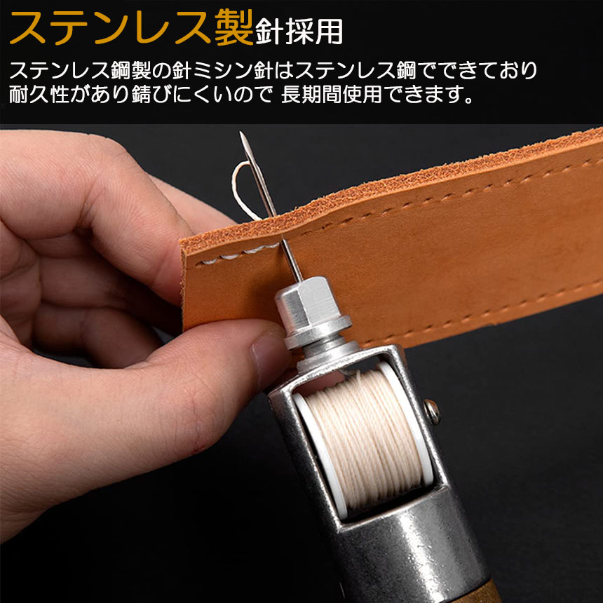【使用方法】1.針を革や布など縫いたい場所に刺し、反対側へ糸を出した状態で針を抜きます。2.次の場所にもう一度針を刺し、ステッチャーを少し手前に引き、糸に緩みを持たせます。糸の輪ができますので、さきほど反対側へ出しておいた糸通します。3.針を抜いて2本の糸を両側から均等に引っ張り縫い上げます。4.この作業を繰り返して縫製してください。