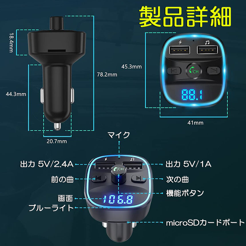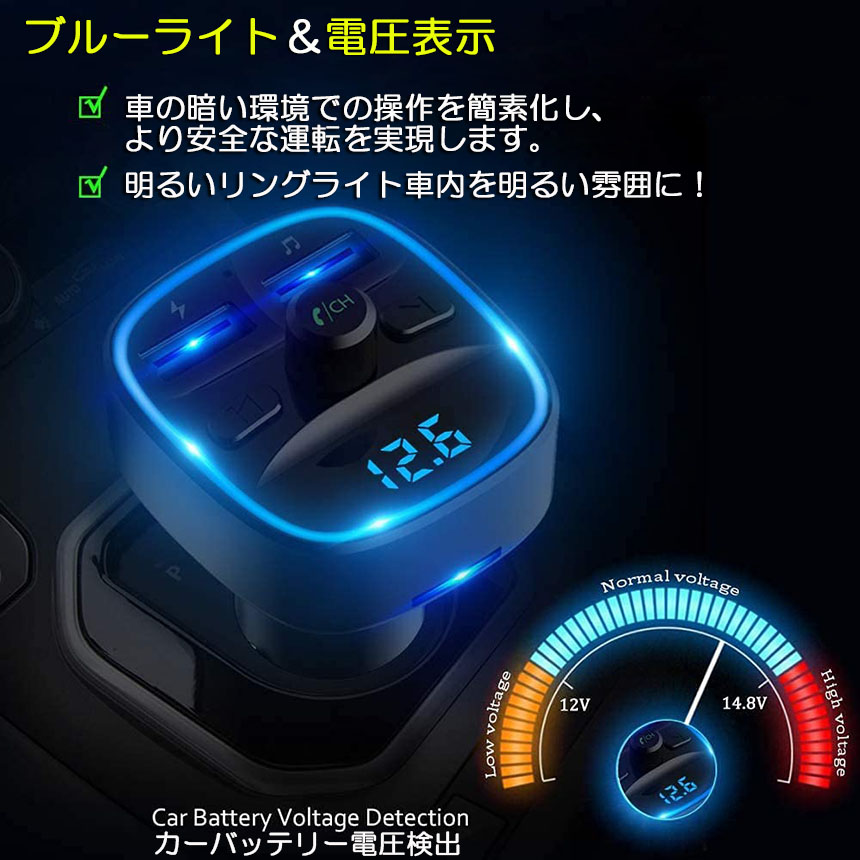 【ブルーライト&LEDディスプレイ】:オンにすると、青色のライトが点灯し、車内の暗い環境で使いやすくなり、楽しい雰囲気をもたらします。 LED画面に表示される音量、車の電圧、FM周波数を簡単かつ便利に表示できます。