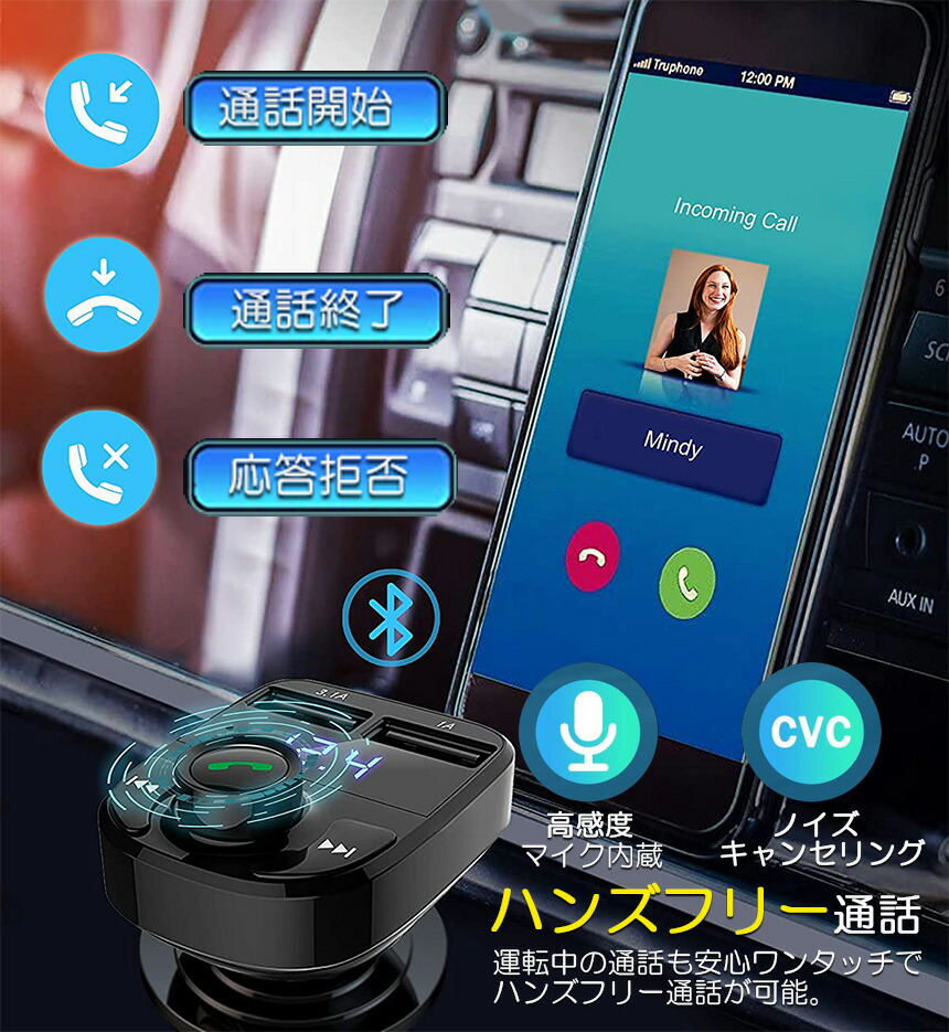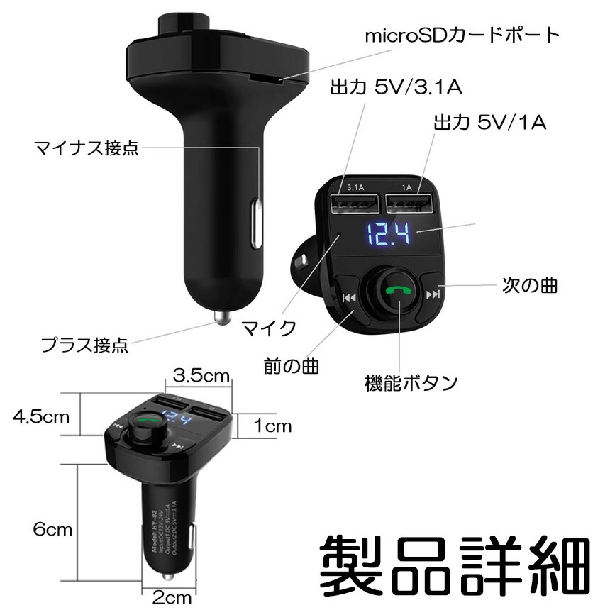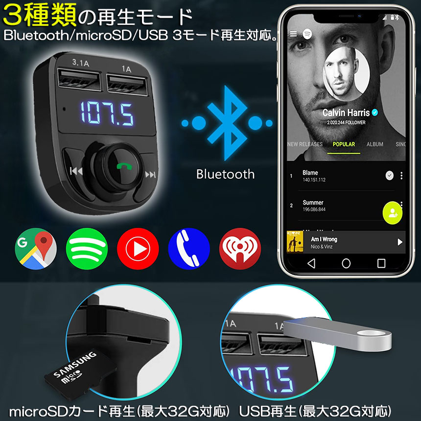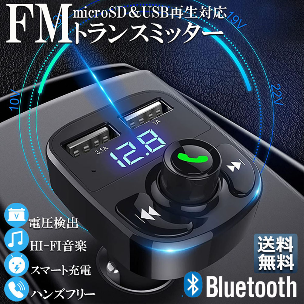 bluetooth FMトランスミッター 3.1A 充電 FMトランスミッター bluetooth 対応 ハンズフリー micrSD USBメモリー 再生対応 シガーソケット 車載 充電器 カーチャージャー 12V 24V<br>