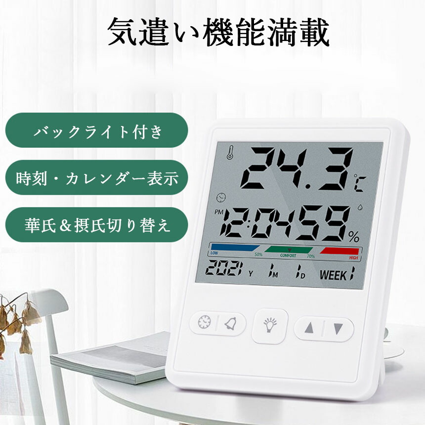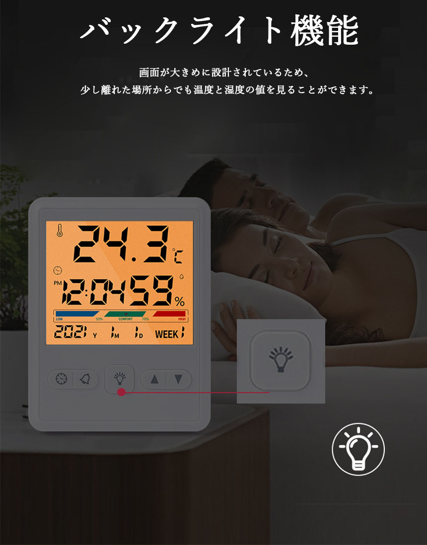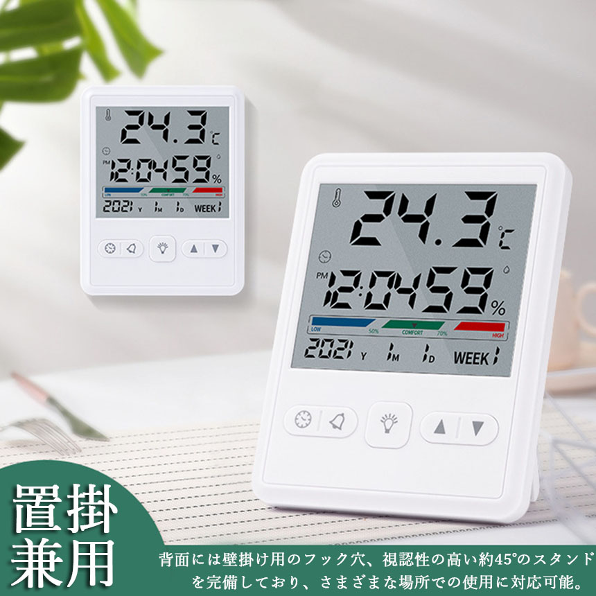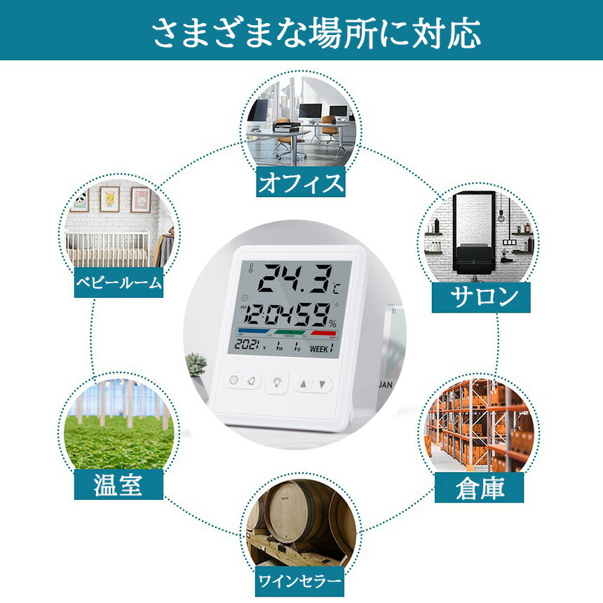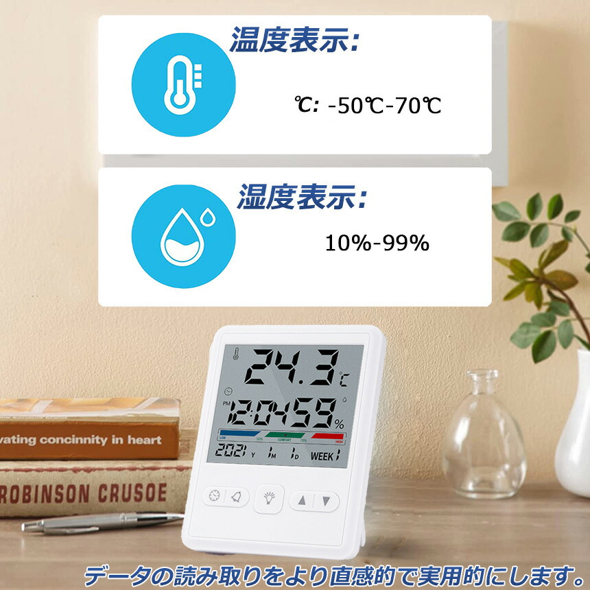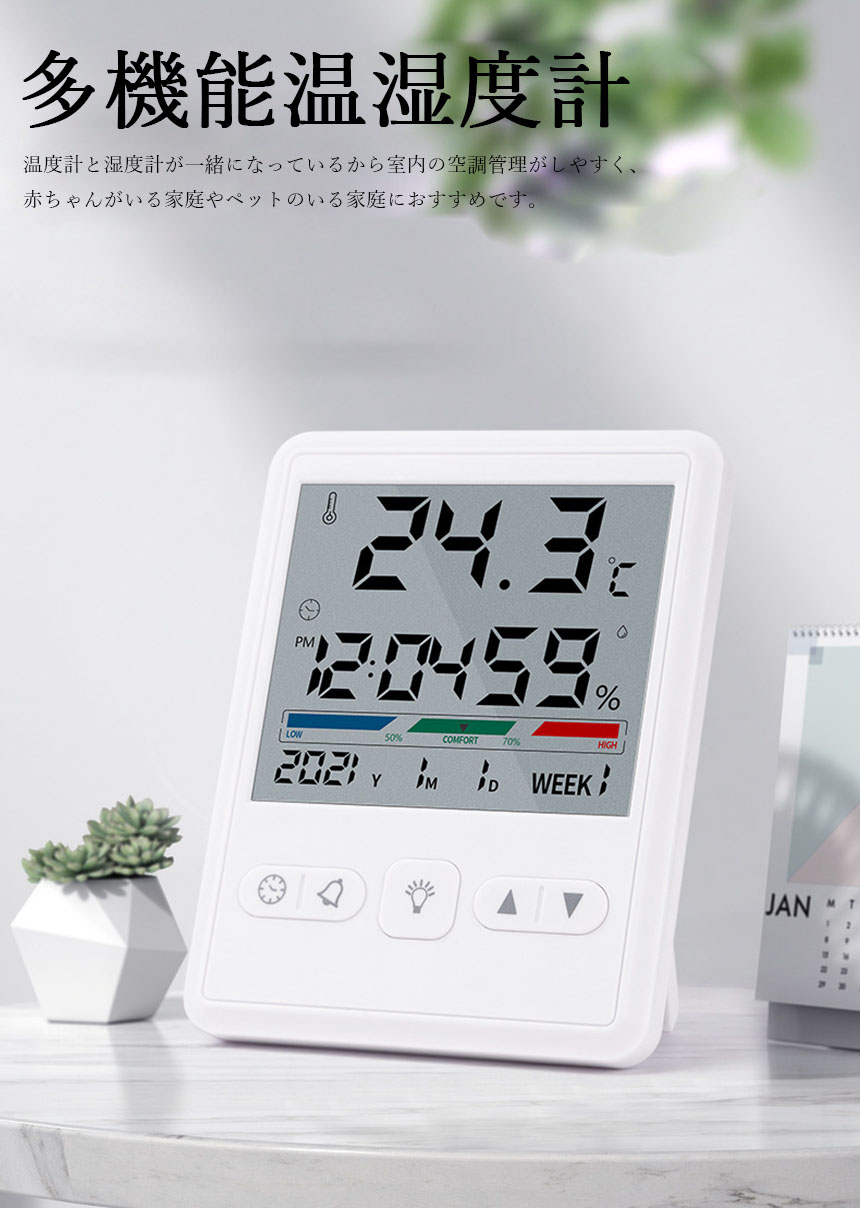 多機能:この温度計湿度計は、屋内の湿度と温度を測定するだけでなく、クロックとアラーム機能を備えています。ボタンの切り替えで、勤務時間を設定して、見逃さないようにすることができます。