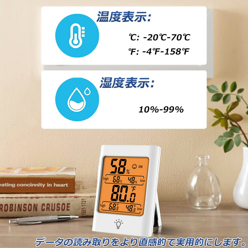 【高性能】10秒ごとにデータの更新、24時間最高・最低温湿度の表示(最高と最低のデータはリセットするまでの全ての期間での記録)、感度と精度両方とも優れています。バックライト機能も付いているので、薄暗い所でも設定と数値読みが便利です。