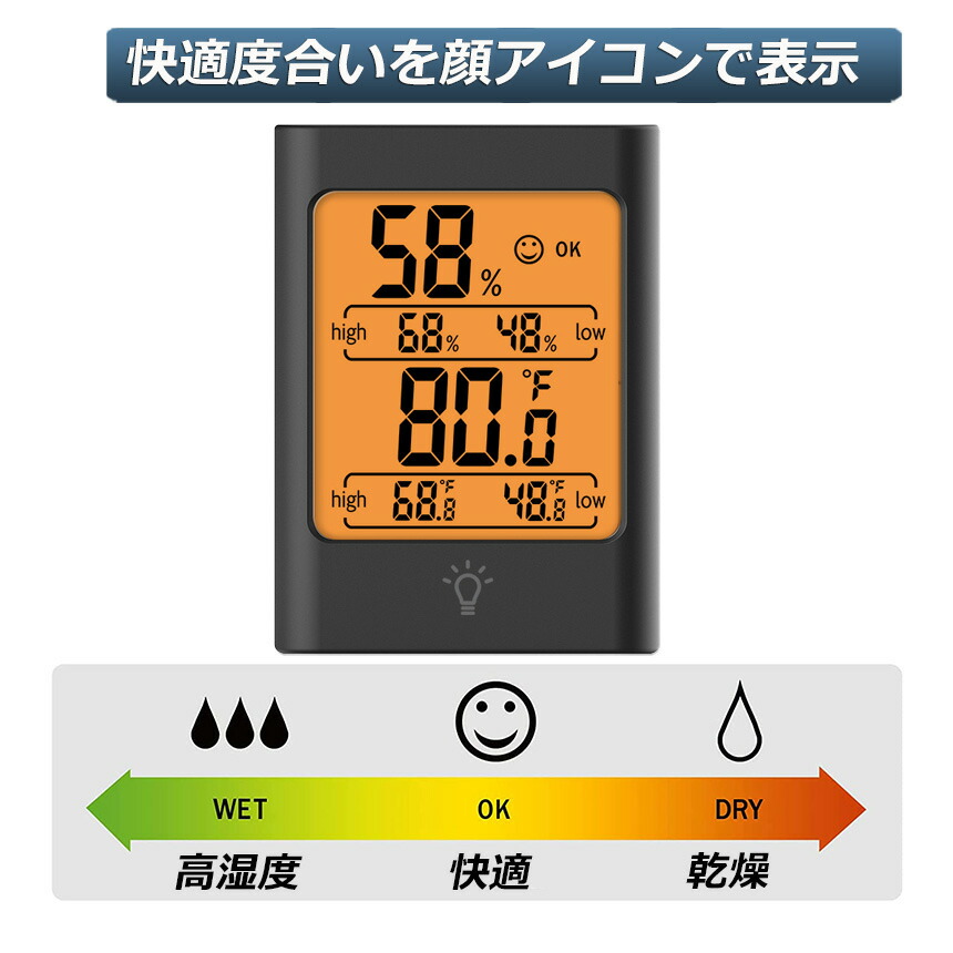 【快適レベル表示】温度・湿度計は「乾燥、快適、多湿」の3段階で快適レベルを表示するので一目で分かりやすいです。ご注意:防水仕様ではありません。
