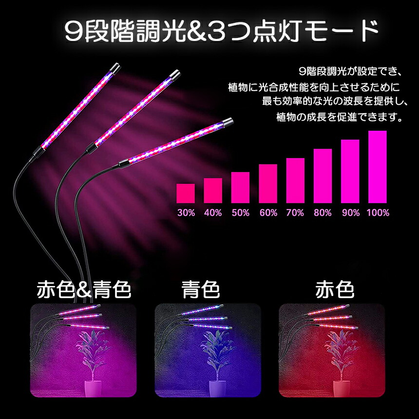 植物育成ライト LED植物育成灯 室内栽培ランプ 3つ照明モード 9段階調光 観葉植物 3ヘッド式ライト 5v 60w 自動ON/OFF 室内/水耕栽培ランプ タイマ【ライト本体:1個】