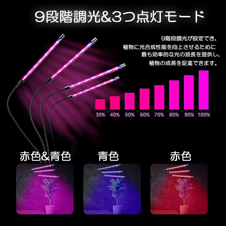LED植物育成灯 植物育成ライト 3つ照明モード 9段階調光 観葉植物 4ヘッド式ライト 5v 自動ON/OFF 室内/水耕栽培ランプ タイマー付き <br>