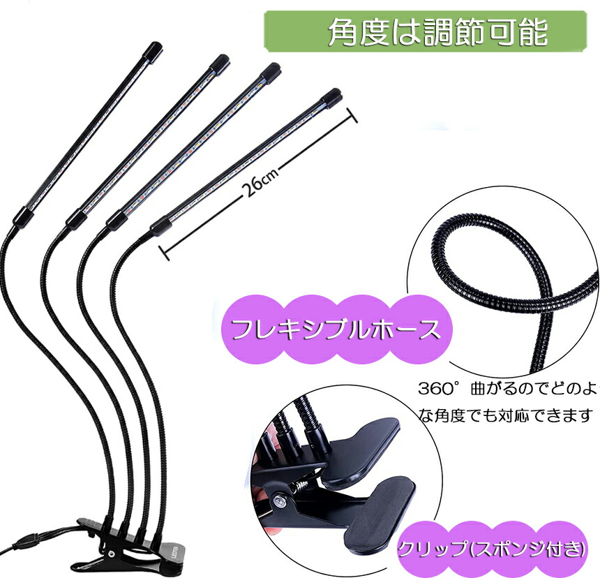 【アップグレードされた植物成長ライト】3つの照射モードと10階段の明るさ調節機能を備えた植物育成ライトです。種類が異なる植物を並べて育てている場合でも、植物に適したライトを照射して育成できます。360°調整可能な4ヘッド設計,この植物ランプは調整してどこにでも配置することが容易である360度柔軟な首とクリップを備えています、4つのライトをフレキシブルに動かして高さや角度を変えられるため、広範囲を照射することも可能です。除外地域