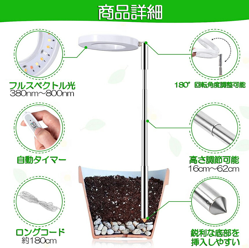 【植物育成ライト】植物にとって日光は必要不可欠です。ほとんどの植物が成長し、生命力を維持するためには、太陽に近い光が必要です。 太陽光にはさまざまな波長の光が含まれており、植物はその光を吸収して餌とします。 このライトで、植物の日照時間を延ばし、植物の生命維持に役立てることができるのです。